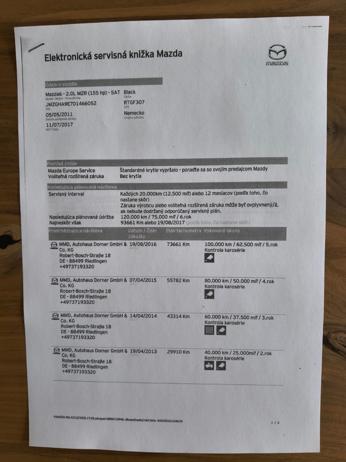 Auto je aktuálne privezené z Nemecka od súkromnej osoby druhého majiteľa. Auto nebolo nikdy havarované. Hodnoty hrúbky laku sú originálne, fabrické, čo preukazuje aj Protokol z kontroly originality. K dispozícii je výpis z digitálnej servisnej histórie MAZDA a staré protokoly z nemeckej STK na preukázanie pravosti najazdených km. Výrobcom predpísaný servisný interval je flexibilný, najčastejšie však každých 20 000 km alebo 1x za 12 mesiacov, podľa toho čo nastane skôr. Menené boli komplet brzdy a mnohé iné komponenty. Auto sa nachádza vo veľmi zachovalom technickom aj optickom stave a iba s minimálnymi stopami používania. Keďže auto bolo garážované a nikdy nebolo havarované, karoséria je absolútne bez korózie. Vozidlo je nefajčiarske a celé profesionálne vyčistené. Benzínové Mazdy sú mimoriadne obľúbenou alternatívou u motoristov, ktorí oceňujú atmosférické motory bez turba a s celoživotnou rozvodovou reťazou.
